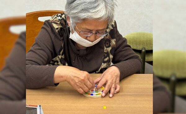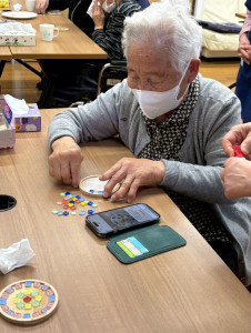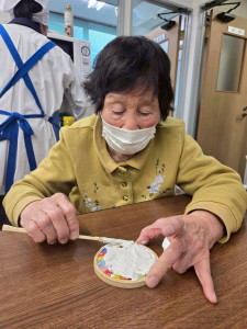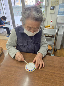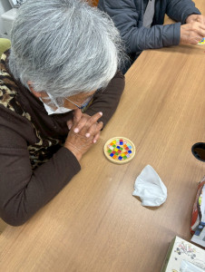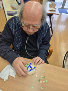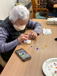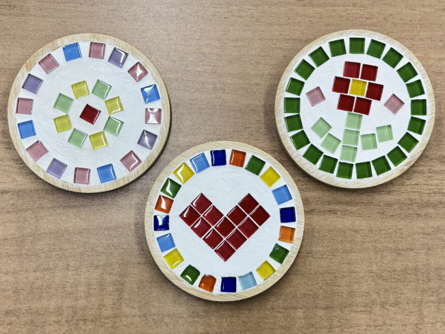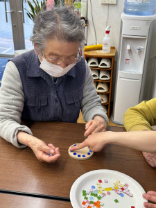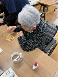 デザインが決まったら、コースターにボンドを塗り、決めたデザインを置いていきます!