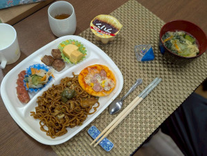 焼きそばに、サイコロステーキやフランクフルト、プリンなど!いつもより豪華なランチ✨